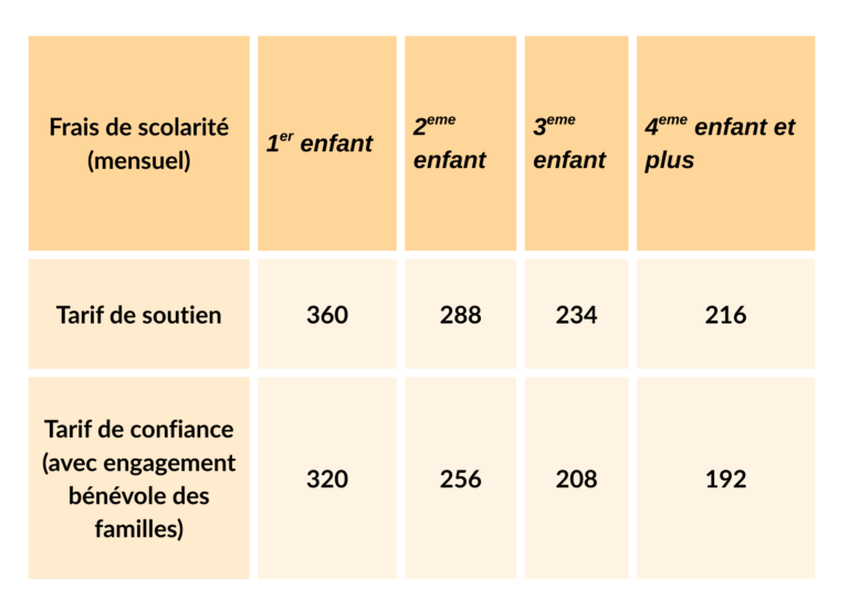 Deux tarifs dégressifs sont proposés aux familles afin de les soutenir: un tarif de soutien et un tarif de confiance où les familles donnent du temps bénévolement à l’école pour participer à l’équilibre budgétaire.